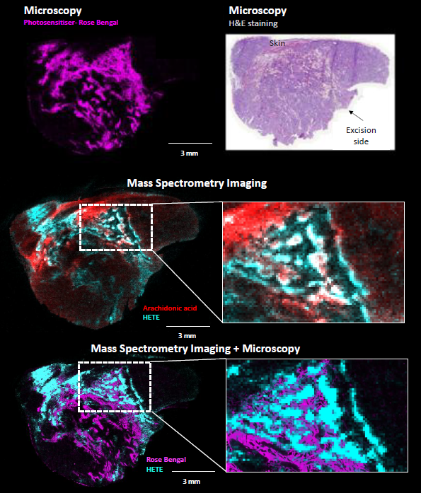 Spatial distribution of arachidonic acid (AA) and its oxidized product hydroxy arachidonic acid (HETE). The distribution or AA matches the areas with remaining skin structure whereas HETE is localized in close proximity to regions with Rose Bengal. Similarly, other oxidized fatty acid species (shown in the table above), such as hydroxyl linoleic acid, hydroxy EPA, and dihydroxy EPA, were also detected with a similar distribution as HETE.