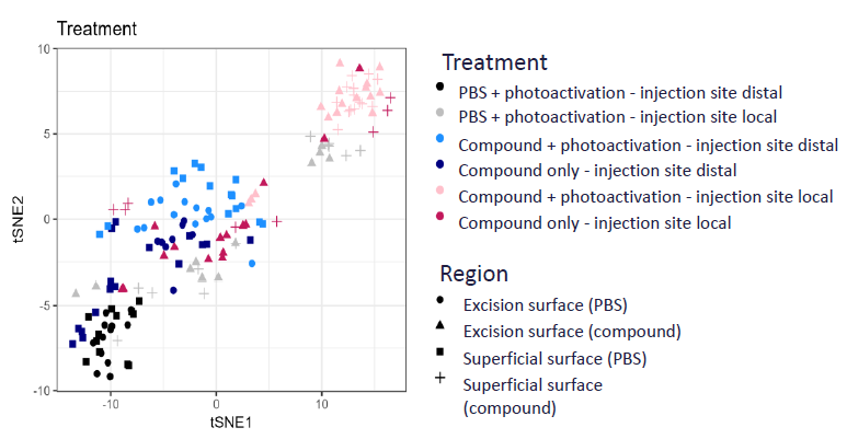 Plot showing the t-SNE dimensional reduction of transcriptomic profiles from samples treated with KLASPDT with and without photoactivation or with PBS and photoactivation (controls).