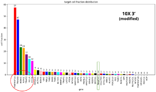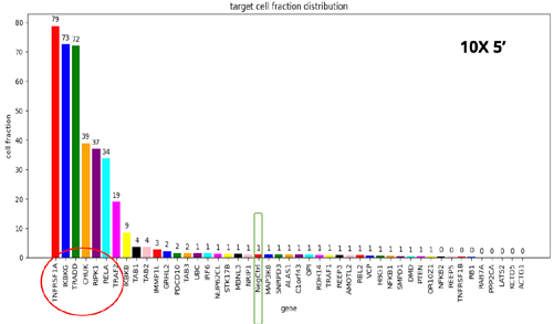 • In all four methodologies, a disruption of the TNFα response was observed by the sgRNAs targeting the TNFα receptor. The highest level of disruption was detected with the 10X 5’ kit, where the TNFα response was abrogated entirely in three out of four cases.