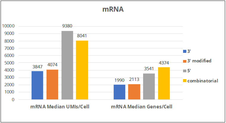 • Interestingly, the 5’ kit seems to be the best at detecting the highest number of mRNA molecules per cell, while combinatorial barcodes seem to be able to detect the most genes per cell, which might mean that it is better than the 5’ kit at detecting low-abundance mRNAs