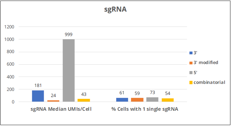 • The best performance in detecting sgRNAs translates to a higher percentage of cells with assigned single sgRNAs, so a higher percentage of cells are available for transcriptional analysis.