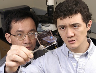 "This chip gives us a new tool to look into biological questions," said Wang (pictured at left), who also is a faculty member of the Whitaker Biomedical Engineering Institute at Johns Hopkins. "Eric can actually interact with and manipulate individual DNA molecules." Results from Simone's work were included a paper presented at the 17th IEEE International Conference on Micro Electro Mechanical Systems, held recently in The Netherlands. The undergraduate was listed as second author on the paper.