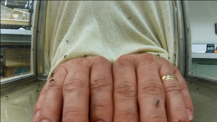 A person’s scent, Bernier explained, comes from hundreds of compounds on the skin, many emitted through sweat and others produced by bacteria. To identify which of these attract mosquitoes, Bernier and colleagues used a special mosquito cage divided by a screen. They sprayed various substances into one side of the cage, and documented the effects in attracting mosquitoes. Some compounds, like lactic acid — a common component of human sweat — were definite mosquito lures, drawing 90 percent of the mosquitoes to the screen. With other compounds, however, many of the mosquitoes didn’t even take flight or seemed confused.