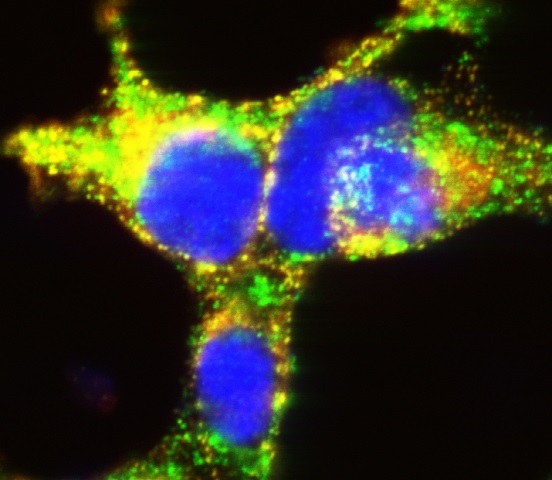 The new study uncovered critical protein interactions in insulin-producing cells. Here, beta cells grown in culture illustrate the importance of TMEM24 in mature storage container granules (yellow) that deliver highly concentrated insulin packets to manage glucose levels after and between meals. (Image courtesy of the Balch lab, The Scripps Research Institute.)