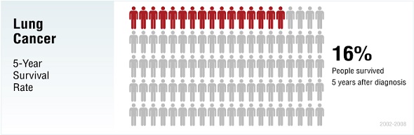 Graph showing the most recent NCI Surveillance, Epidemiology, and End Results (SEER) data of estimated 5 year survival rate in lung cancer. For the years 2002-2008, 16 percent of people survived 5 years after diagnosis.