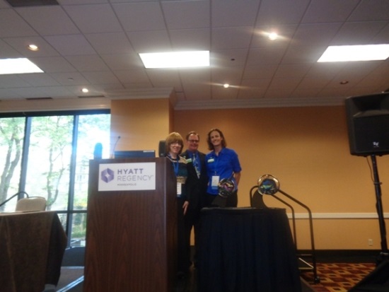 Janet Sunness (l.), Medical Director of Richard E. Hoover Low Vision Rehabilitation Services at the Greater Baltimore Medical Center, accepts the Envision Award in Low Vision Research from Michael Epp, Director of Professional Education, and Dr. Laura Walker, Executive Director of the Envision Research Institute, during the September 18 Opening Plenary Session of the 9th Annual Envision Conference in Minneapolis. The peer-reviewed award recognizes mid-career senior investigators in low vision and vision rehabilitation research. Dr. Sunness is an ophthalmologist specializing in low vision rehabilitation, retinal disease and clinical visual function testing, and is recognized as an authority on advanced dry macular degeneration. She is also director of one of the nine clinical centers worldwide involved in a natural history study of Stargardt disease.