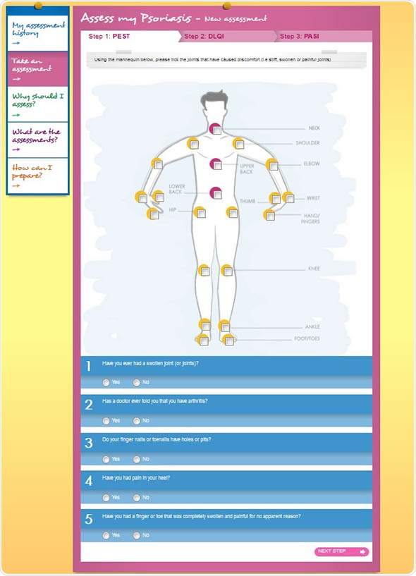 PsoriASSESS is a clinical, integrated psoriasis website for both patients and dermatologists. Its goal is to provide a more objective picture of the condition, both good and bad, over the time between consultations so that the dermatologist can better assess, diagnose and treat a patient’s psoriasis. Through the website, patients can take quick and easy self-completion questionnaires as well as compile a regular diary, complete with pictures of their psoriasis as it fluctuates over time.