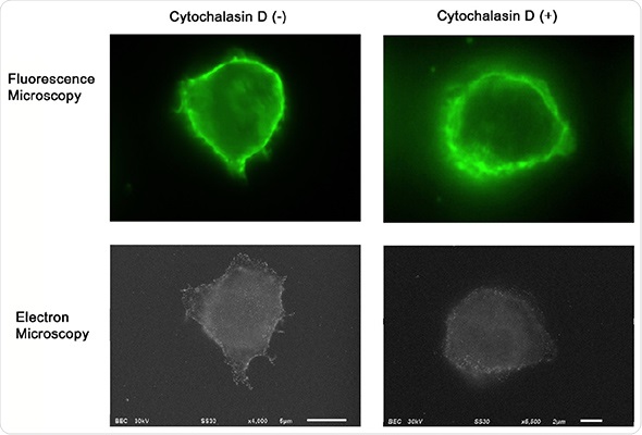 "Dual labelling was employed using an anti-CD44 monoclonal antibody and a secondary antibody conjugated with Alexa Fluor 488 and 1.4 nm positively charged Nanogold particles," says Toshiyuki Murai, lead author of the paper. "We also demonstrated that treatment of cells with cytochalasin D resulted in the loss of the microvilli projections and the simultaneous nullification of CD44-mediated adhesion to its ligand hyaluronan. These results suggest the functional relevance of microvilli in CD44-mediated rolling adhesion under shear flow."