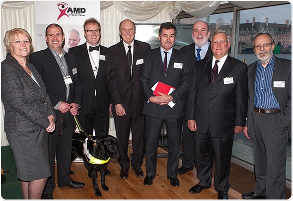 (from left to right): Ms Lesley-Anne Alexander CBE, Royal National Institute of Blind People, Mr Danny Gleeson, Guide Dogs for the Blind (with Dylan the Guide Dog), Dr Alan Cruess, AMD Alliance International, Dr Keith Gordon, AMD Alliance International, Mr Michael Valenzia, Macular Society, Mr Dennis Lewis, Macular Society, Mr Mark Ackermann, AMD Alliance, Prof Ian Banks, European Forum Against Blindness (EFAB).