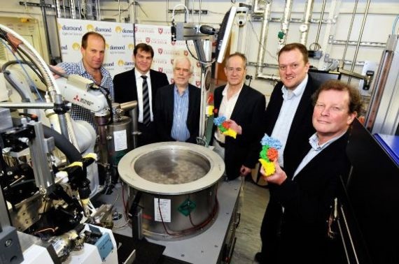 Researchers with the model of the protein structure at Diamond Light Source. Credit: Diamond Light Source