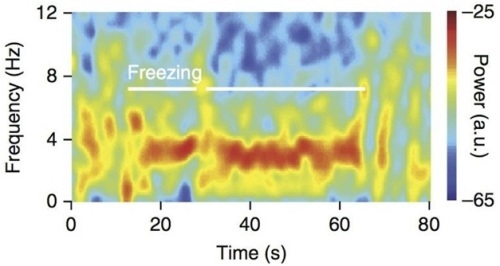 In the present study we demonstrate for the first time that freezing behaviour is tightly associated with an internally generated brain state that manifests in sustained 4 Hz oscillatory dynamics in the dmPFC-BLA circuits. Furthermore, 4 Hz oscillations accurately predicted onset and termination of the freezing state.