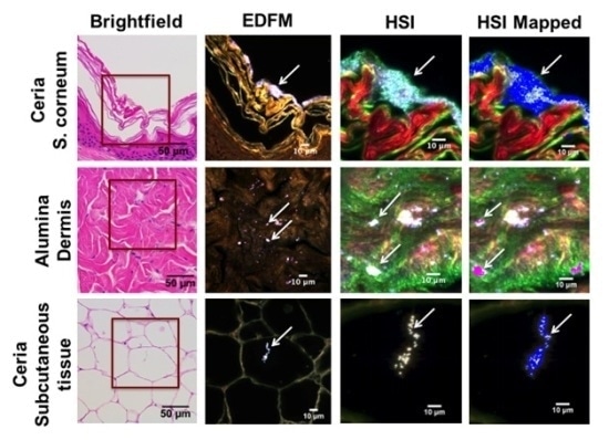 Porcine skin tissue exposed to ENM-containing solution and mapped against the reference spectral library (RSL). Rows correspond to porcine skin tissue exposed to ceria and alumina ENMs, respectively. Each column shows the same field of view imaged with different techniques. The first column corresponds to a brightfield image of a hematoxylin and eosin stained sample (40x magnification). The area enclosed in a red square was magnified to 100x and viewed using EDFM (column 2) and HSI (column 3), where ENMs appear as high contrast elements (arrows). Column 4 shows the HSI image mapped against the RSL, where the positive matches are shown in blue for ceria and in magenta for alumina. From top to bottom, the rows correspond to: stratum corneum, dermis, and subcutaneous tissue, respectively.