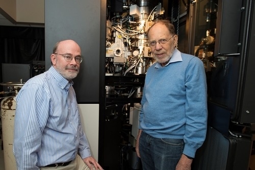 Michael Rossmann (right), Purdue University’s Hanley Distinguished Professor of Biological Sciences, and Richard Kuhn, director of the Purdue Institute for Inflammation, Immunology and Infectious Diseases, stand with the cryo-electron microscope used to determine the structure of the Zika virus. (Purdue University photo/Mark Simons)