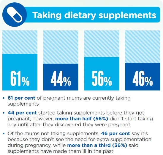 All but two nutrients - folate/folic acid and vitamin D – can be consumed by eating a well-balanced, nutritious diet. It is recommended that a daily supplement of 10µg Vitamin D should be taken throughout pregnancy, and 400µg of folic acid prior to conception and until at least the 12th week of pregnancy. Some women will be prescribed 5mg of folic acid per day instead of 400µg.