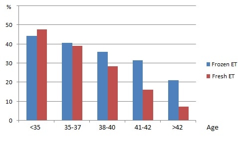 According to the SART-published success rate statistics in IVF clinics as of 2013, the results showed a significant increase in the live birth rate from FETs after the age of 38 years, compared to that of fresh ET.