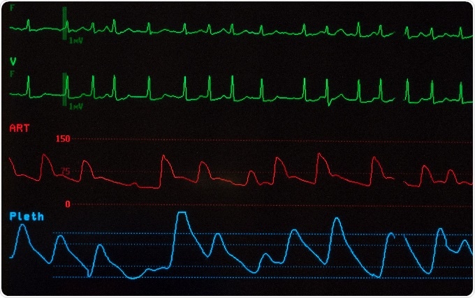 Medical monitor with green lines of an abnormal ECG showing atrial fibrillation. Red line = arterial blood pressure, blue line = oxygen saturation. Credit: Teresa Otto/Shutterstock.com