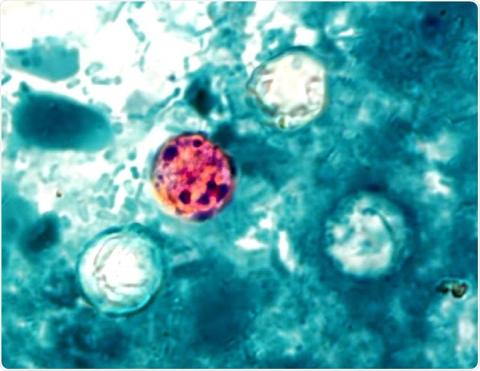 Image: Photomicrograph of a fresh stool sample, with a presence of four Cyclospora cayetanensis oocysts in the field of view.