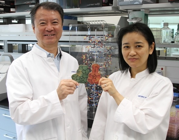 IBN researchers Dr Ichiro Hirao and Dr Michiko Kimoto holding up a jigsaw puzzle inspired model of their new genetic alphabets – Ds and Px, which can pair up to form the third DNA base pair.