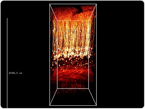 3D reconstructed image of mouse in vivo brain (Thy1-YFP-H mouse sensory cortex) acquired using TruResolution objective with auto adjustment function. Image data courtesy of Dr. Hiromu Monai, Dr.Hajime Hirase and Dr. Atsushi Miyawaki, RIKEN BSI-Olympus Collaboration Center.