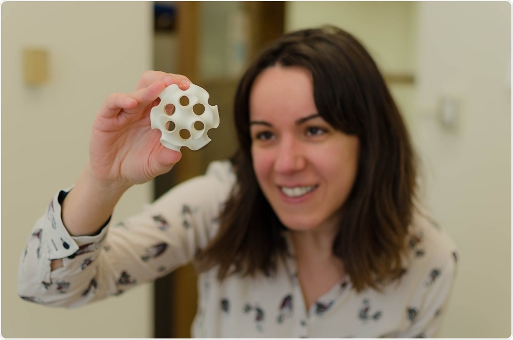Dr. Cecilia Leal holding a 3D printed model of a super-swelled bicontinuous cubic phase monocrystal