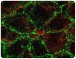 Image from a confocal microscope showing so-called pin-wheel structure of the lateral wall of the lateral ventricle: ENaC-positive adult neural stem cell (red) surrounded by ependymal cells. Source: Helmholtz Zentrum München