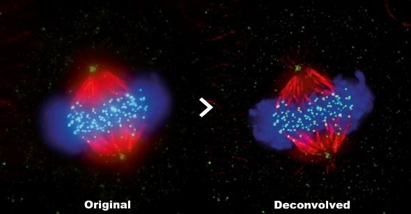 A fluorescent image shown before (left) and after (right) deconvolution with the image deconvolution module in cellSens 2.1.