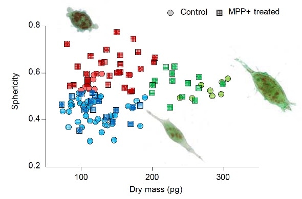 Quantitative characterization of SH-SY5Y cells in the presence of MPP+. Red, Apoptotic cells; Green, Dividing cells; Blue, Normal cells.