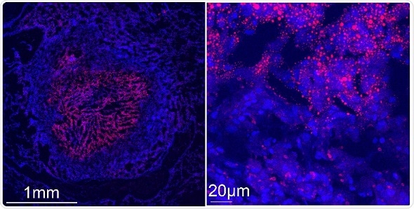 Confocal microscopy images show a tuberculous rabbit lung necrotizing granuloma stained with Nile red (red) and DAPI (blue) to reveal lipid-laden cells. Left image: the center of the granuloma is occupied by caseum, a “cheese-like” material that becomes increasingly acellular as necrosis progresses. The caseum is surrounded by a cellular region containing macrophages and lymphocytes. Right image: higher magnification of the cellular region of the granuloma immediately surrounding the caseum. Nile red-stained storage lipids are visible in caseum and in the surrounding foam cells.