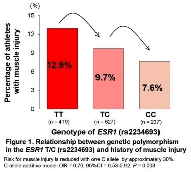To test whether sex-related genetic polymorphisms are associated with muscle injury and stiffness, Noriyuki Fuku from Juntendo University and colleagues report in the journal Medicine & Science in Sports & Exercise that ESR1 rs2234693 polymorphism is associated with both muscle injury and muscle stiffness. These findings suggest a role of estrogen in lowering muscle stiffness by suppressing collagen synthesis, as well as having anti-inflammatory and anti-oxidant effects.