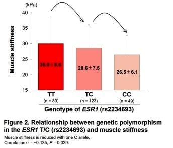 Relationship between genetic polymorphism in the ESR1 T/C (rs223493) and muscle stiffness.