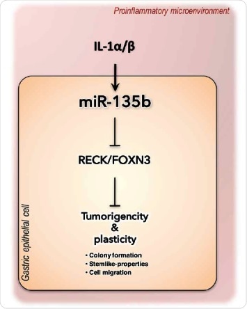 The series of molecular steps linking inflammation and cancer, as shown in the gastric epithelial cells. Inflammatory molecules IL-1α/β, lead to enhancement of MIR135B. This is turn activates FOXN3 and RECK genes, that lead to tumor-like properties in cells.