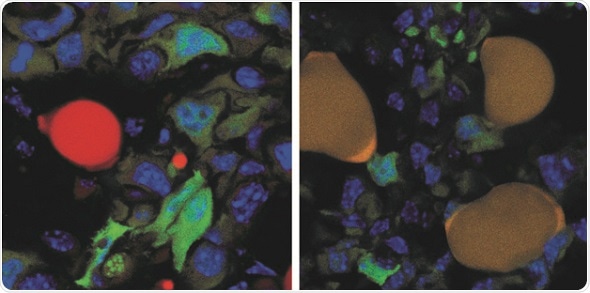 The left image shows green fluorescent protein (GFP)-expressing cancer cells (green) and a normal lipid-filled adipocyte (red) at the surface of a control-treated tumor. The right image shows GFP-expressing cancer cells (green) and GFP-expressing cancer cells that have converted into adipocytes (green + red = dark yellow) upon trans-differentiation therapy. CREDIT: Department of Biomedicine, University of Basel.