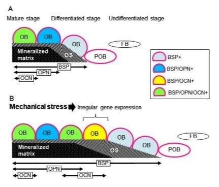 B: Irregular gene expression pattern of non-collagenous proteins during OB differentiation stimulated by mechanical stretching. Some OBs expressed BSP, and also OCN, ahead of OPN expression (BSP/OCN+).
