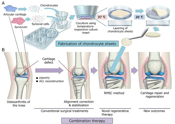Osteoarthritis (OA) is a joint disease, caused by breakdown of the cartilage in the joint — cartilage is a ‘biological lubricant’ that contains no blood vessels or nerves, but mainly cells known as chondrocytes. OA leads to the gradual loss of a human’s mobility, thus negatively affecting a patient’s quality of life. No cure exists for stopping OA progression. Chondrocyte implantation products are sometimes applied, but for OA of the knee, such implantation approaches are not effective. Now, Masato Sato, professor at the Tokai University School of Medicine, and colleagues have shown that an approach combining conventional surgery and chondrocyte cell-sheet transplantation is a promising therapy for OA of the knee.