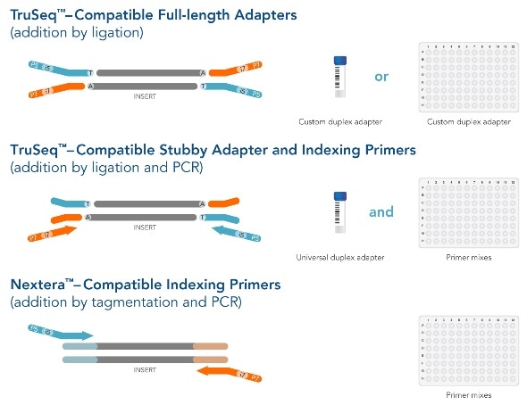 IDT is widely recognized as the leader and a pioneer in custom oligo manufacturing, with more than 30 years’ experience and expertise. NGS adapters are a specific type of custom oligo, and consequently, IDT has unrivaled manufacturing expertise in this area. Unlike other array and chip-based manufacturers, IDT adapters and other products are individually synthesized using stringent, proprietary methods that deliver the highest-quality in every single batch – critical for NGS applications. As demonstration of IDT’s proficiency, in 2017 the company announced a partnership with Illumina to develop and manufacture a portfolio of indexed NGS adapters for use on Illumina instruments. In order to lower barriers to NGS and provide unmatched flexibility, IDT has now made these adapters easily accessible to users of all levels, enabling researchers to better tailor library preparation to their specific applications. There are three, high-quality configurations available – TruSeq-Compatible Full-length Adapters, TruSeq-Compatible Stubby Adapter and Indexing Primers, and Nextera-Compatible Indexing Primers.