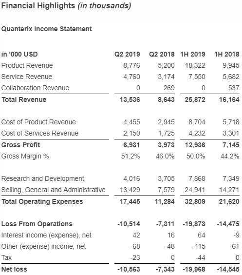 Quanterix Corporation, a company digitizing biomarker analysis to advance the science of precision health, today announced financial results for the three and six months ended June 30, 2019.