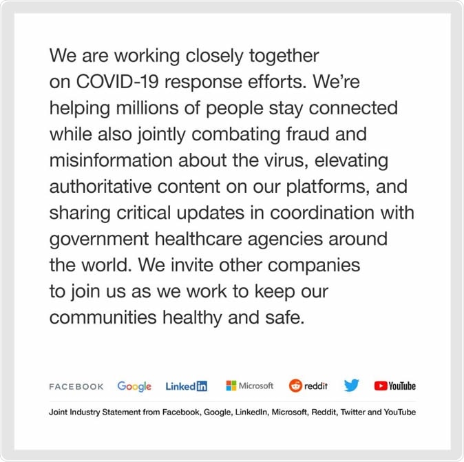 They wrote, “We are working closely together on COVID-19 response efforts. We’re helping millions of people stay connected while also jointly combating fraud and misinformation about the virus, elevating authoritative content on our platforms, and sharing critical updates in coordination with government healthcare agencies around the world. We invite other companies to join us as we work to keep our communities healthy and safe.”