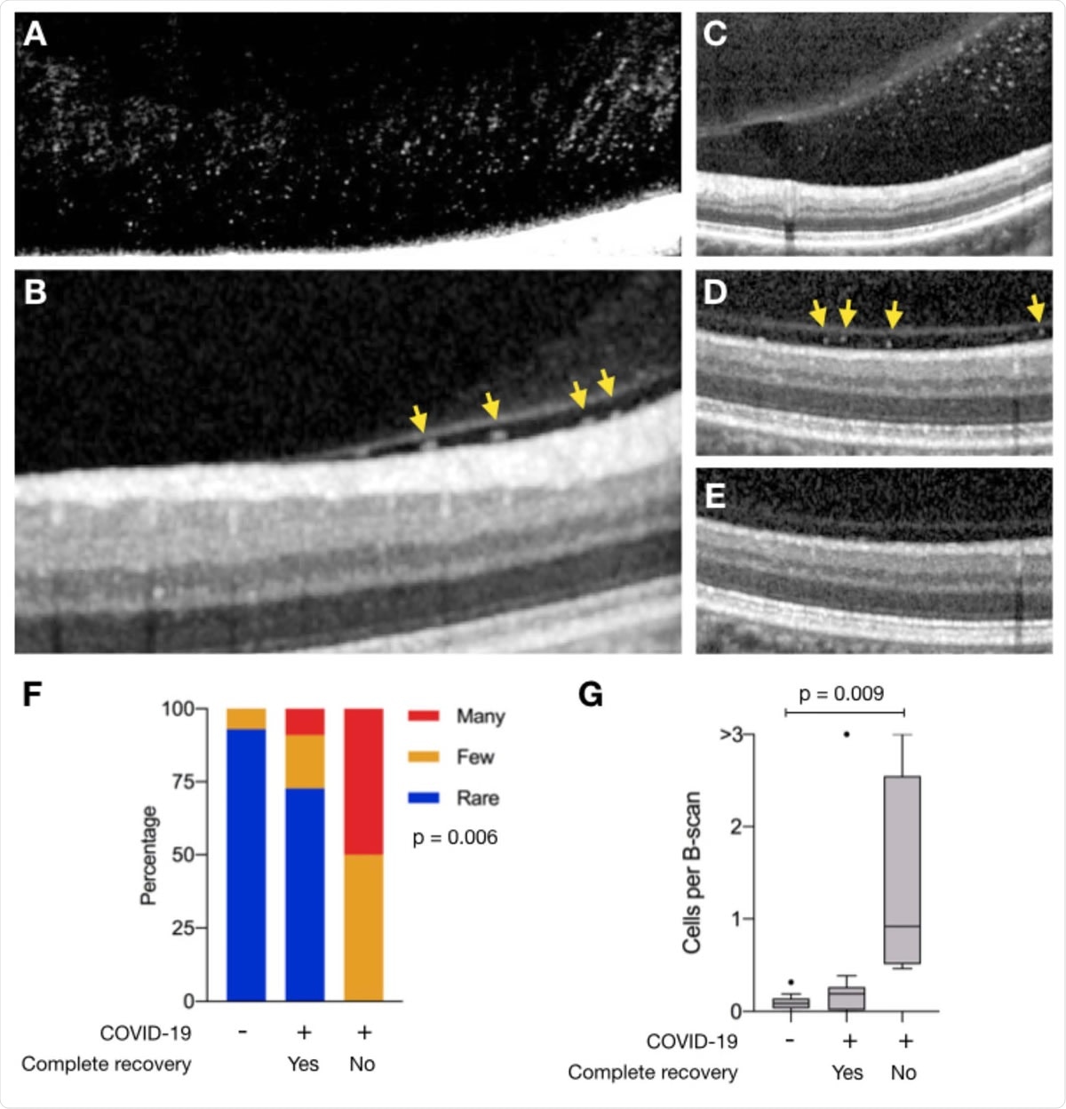 Vitreous cells in persons recovered from COVID-19. SD-OCT transverse sections of A) the posterior vitreous near the inferior macular vascular vessels in Participant 1 with many vitreous cells, B) the retina vitreous interface demonstrating cells (yellow arrows) in the sub-hyaloid space in Participant 5 and C) Participant 4. Identical SD-OCT transverse sections of the retina and vitreous of the right eye demonstrating many cells in the subhyaloid space after recovering from COVID-19 (D), and no vitreous cells 2 years prior (E). Corresponding infrared en face images of the retina (not shown) were used to determine the exact reference location. The image in panel A was digitally enhanced to highlight vitreous cells. The adjustment has been made to the entire image. (F) The distribution of vitreous cells grading (rare, blue; few, orange; many, red) among individuals with no history of COVID-19, and those with prior COVID-19 infection who fully recovered (Yes) and those who did not (No). Significance was determined using Pearson’s chi-squared test (p = 0.006). (G) Box plots showing the number of vitreous cells per transverse B-scans among individuals with no history of COVID-19, and those with prior COVID-19 infection who fully recovered (Yes) and those who did not (No). Significance was determined using one-way ANOVA (p = 0.01) and student’s test with Tukey’s correction.