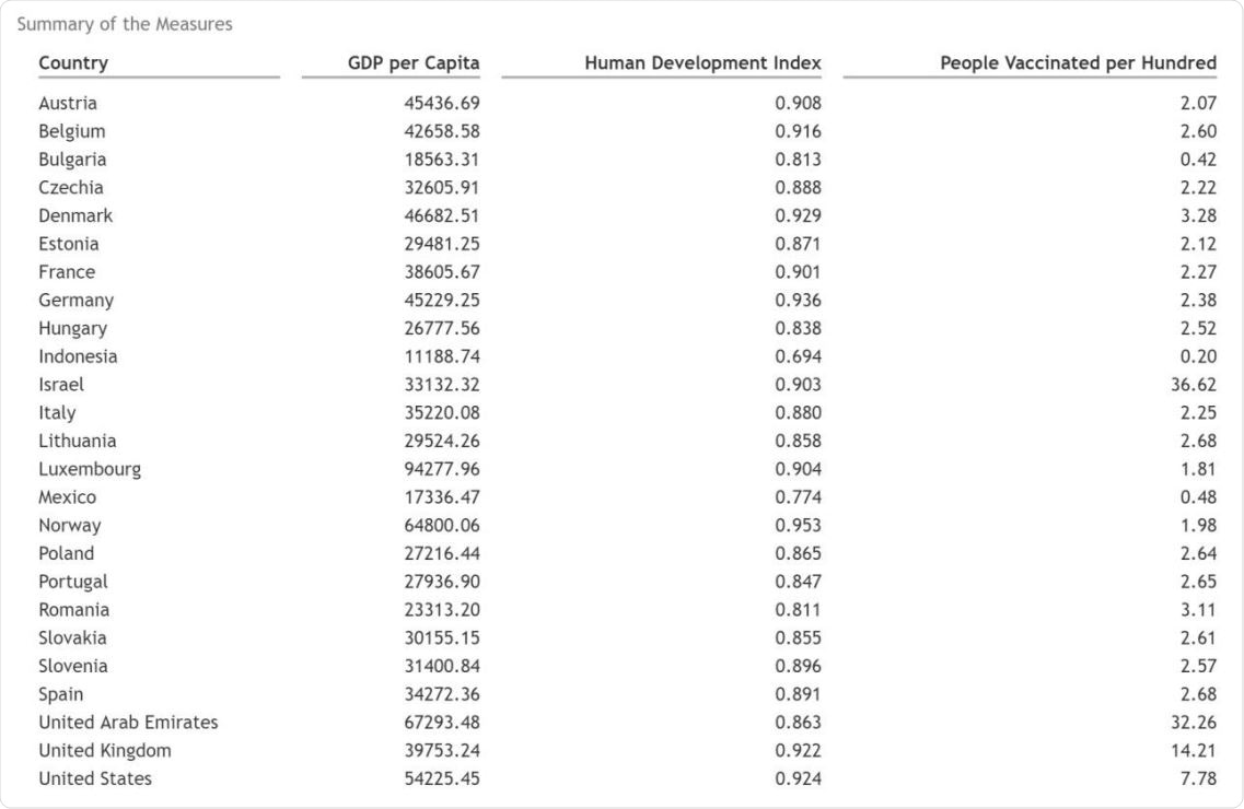 Data for this analysis was taken from the Coronavirus Pandemic data sets of Our Data in World. The site provided daily vaccination rates in various countries, GDP per capita, and HDI values such as education, life expectation, and living standard measures.