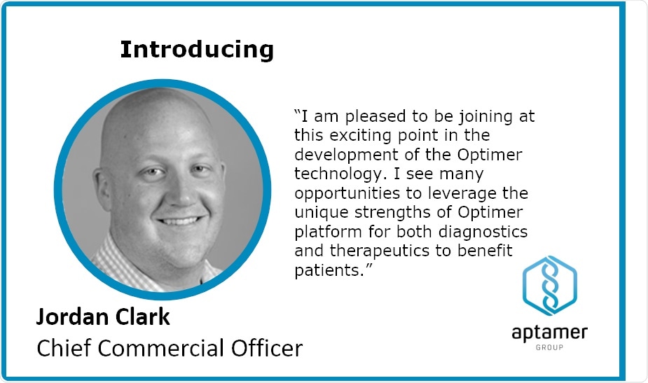 Aptamer Group, the developer of Optimer biotherapeutics and diagnostics, is pleased to announce the appointment of Jordan Clark as Chief Commercial Officer at Aptamer Group with immediate effect.