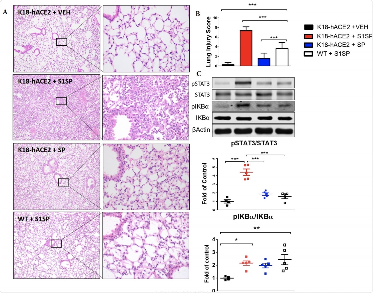 The S1 subunit of the SARS-CoV-2 Spike Protein (S1SP) causes acute lung 378 injury and the activation of the STAT3 and NFκB inflammatory pathways 72 hours after 379 exposure. (A) H&E staining of lung sections demonstrates septal thickening, neutrophil 380 infiltration, and edema in S1SP-instilled K18-hACE2 mice, minimal edema and 381 leucocyte infiltration in S1SP-instilled WT, while SP-instilled K18-hACE2 display minimal 382 changes compared to controls. (B) The Lung Injury Score quantifies maximal injury in 383 S1SP-instilled K18-hACE2 mice, a milder pathology in S1SP-instilled WT and no 384 significant changes in SP-or saline- instilled K18-hACE2 mice. (C) Western blot analysis 385 of lung homogenates revealed increased phosphorylation of IκBα and STAT3. Bands 386 were normalized to β-actin and are shown as fold of control. (Means ± SEM; n=5; *: 387 p<0.05; **: P<0.01; ***: P<0.001 with one-way ANOVA and Tukey’s).