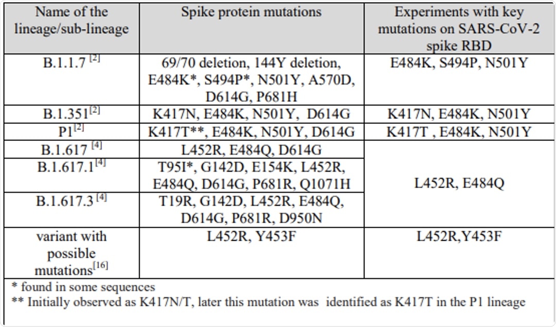 Figure 1. This table illustrates variants of concern which have been selected for investigation regarding specific mutations within the SARS-CoV-2 lineages and the experiments with key mutations on the spike protein RBD.