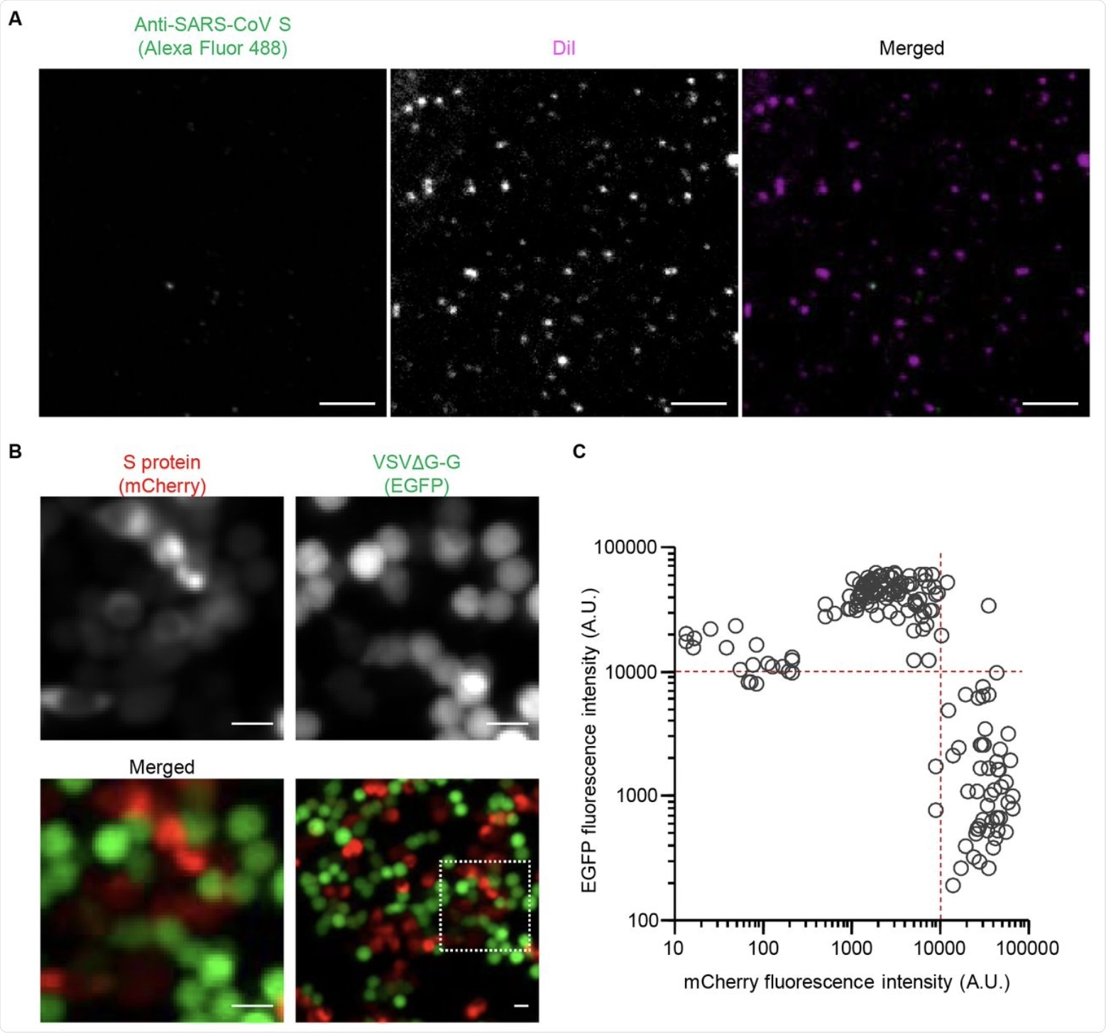 (A) HEK293T cells were transfected with an expression vector for SARS-CoV S protein as well as infected with VSVΔG-G. The culture supernatant was collected and stained with DiI as well as subjected to immunofluorescence staining with antibodies to SARS-CoV S protein and Alexa Fluor 488–conjugated secondary antibodies. The virus particles were then adsorbed onto a polyethylenimine-coated glass-based plate and observed with a confocal fluorescence microscope. Representative images are shown. Bars, 10 μm.