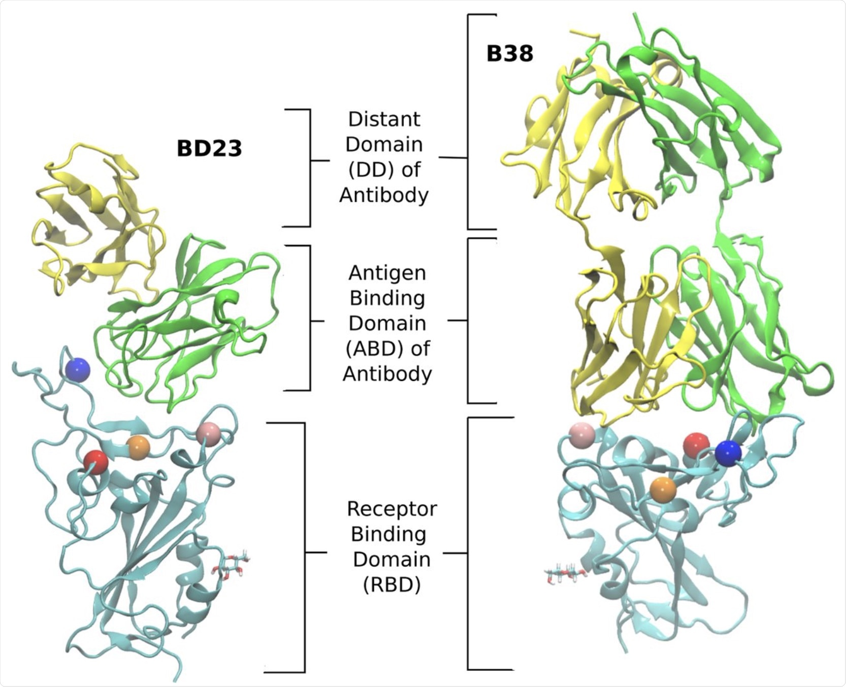 The researchers used molecular dynamics (MD) simulations to understand the dynamic perturbations that occur at the RBD-ACE2 interface. To this end, four RBDs were analyzed in the current study, with one being the wildtype and the others obtained from the alpha, beta, and kappa variants. The authors also used two antibodies of B38 and BD23, which have two or more of the four mutated residues in these RBD variants.