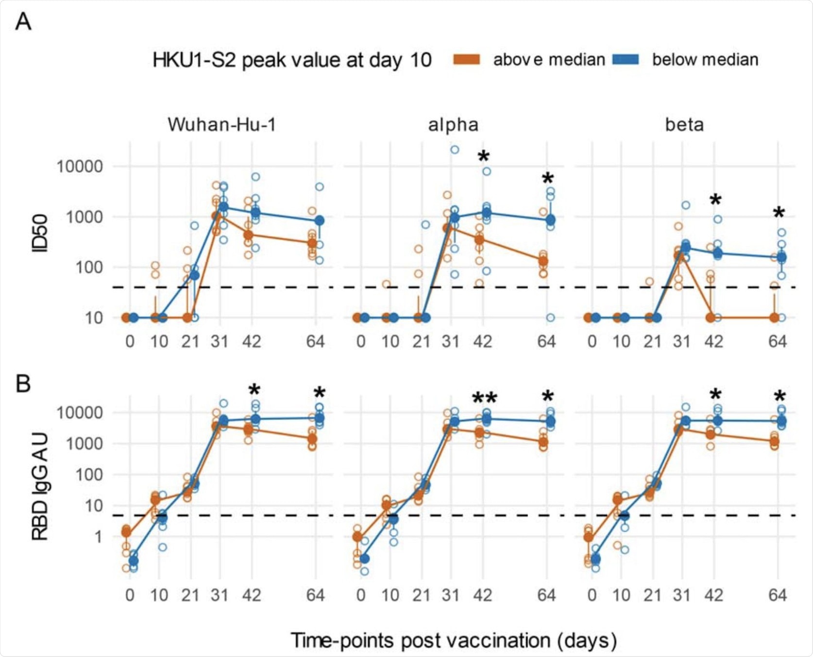 An early boost of HKU1 IgGs post-vaccination is associated with a rapidly decreasing Ab response against SARS-CoV-2 in COVID-19 naïve subjects. Line plots of Wuhan-Hu-1 and VoCs ID50 nAbs (A) and RBD IgG AU (B). Subjects naïve for COVID-19 were stratified as above or below the median of HKU1 S2 IgGs at day 10 post-vaccination. Filled circles and bars represent the median ± inter quartile range at each time-point, empty circles show each individual measurement. The horizontal dashed lines stand for the threshold for positivity. The asterisks indicate statistically significant differences in mean ID50 nAbs or RBD IgG AU at the corresponding time-points between subjects with or without an early boost of seasonal coronaviruses responses after vaccination (two-way repeated measures ANOVA, * p < 0.05, ** p< 0.01).