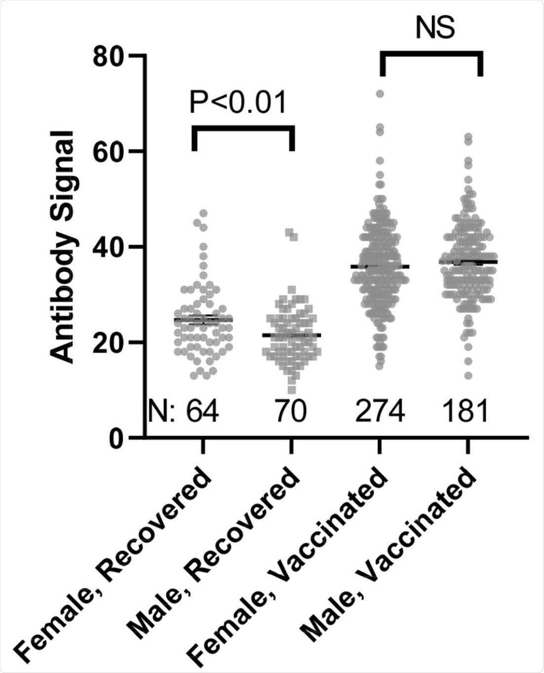 Comparison of Female and Male anti-SARS-CoV-2 spike antibody (IgG) signals. N refers to the number of independent replicates. Vaccinated group is only Pfizer and Moderna as other manufacturer groups did not achieve the numbers necessary for statistical comparison.