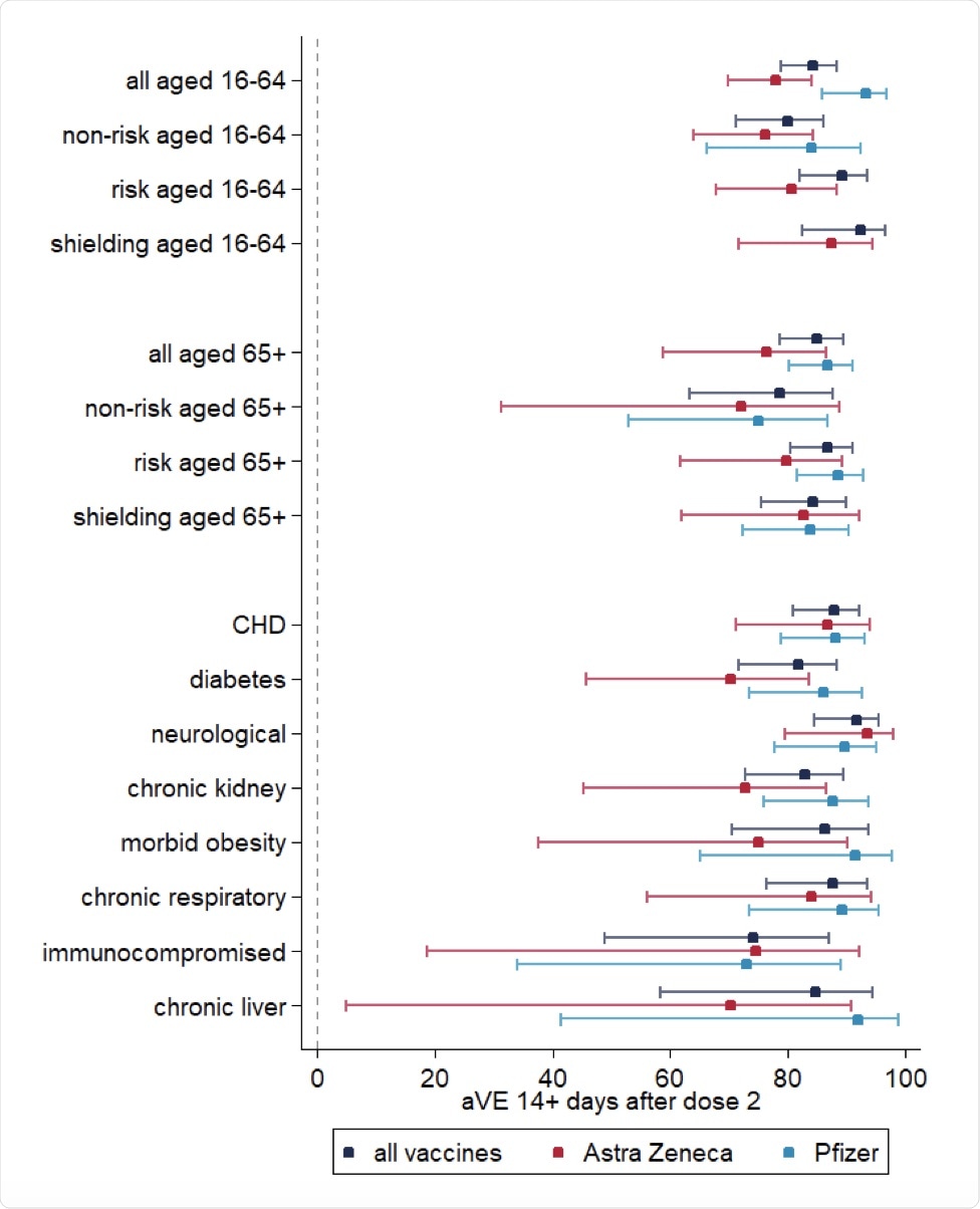 In the current study, vaccine effectiveness was determined from a cohort of 5,642,687 people, of which 1,276,517 were above the age of 65 and 1,054,510 were classified as at-risk for COVID-19. A higher proportion of individuals with comorbidities like chronic heart disease and vascular disease (CHD), chronic kidney disease, as well as chronic respiratory and neurological risk groups were vaccinated between December 2020 and January 2021. Comparatively, individuals over the age of 65 were largely vaccinated between January and February 2021, with both groups receiving a relatively equal among of AstraZeneca and Pfizer vaccines.