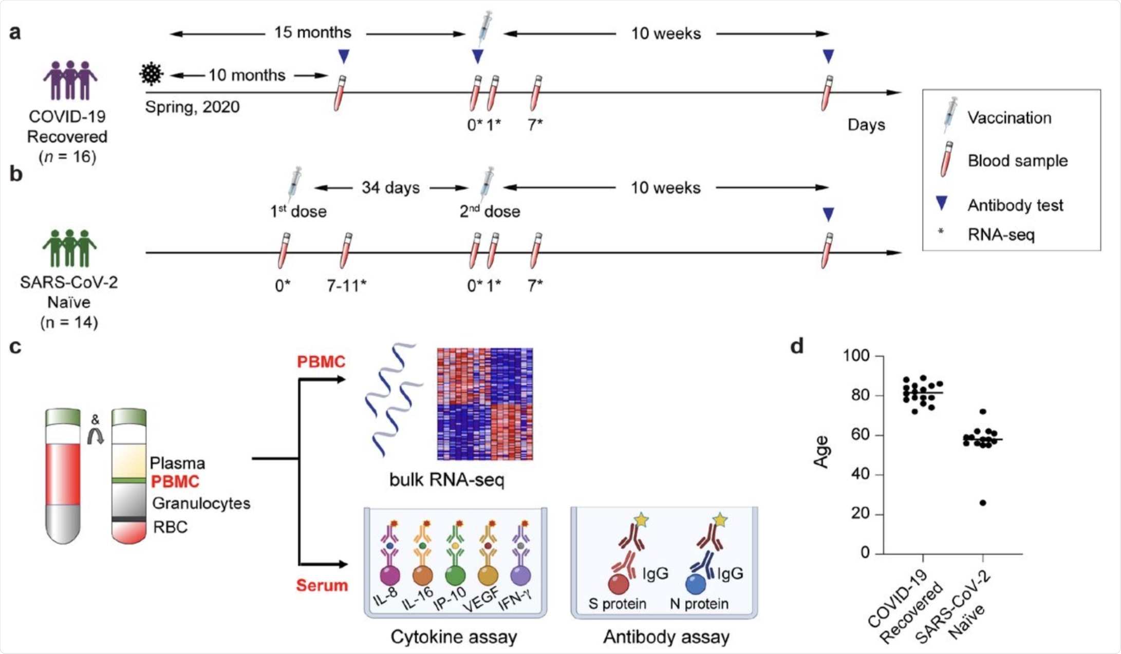 a-c. Schematic presentation of the experimental workflow. (a) elderly population recovered from COVID-19; (b) SARS-CoV-2 antigen-naïve population; the syringes indicate vaccinations; the test tubes indicate the blood drawing and the triangles the antibody testing. The asterisks indicate the days at which samples for RNA-seq was collected. (c) Peripheral blood mononuclear cells (PBMCs) were purified from blood drawn prior to and after the vaccination and RNA-seq was performed at a depth of 240 million reads per sample. d. Age distribution of participants in each cohort.