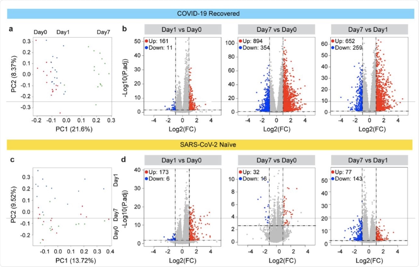 Principal-component analysis (PCA) of transcriptomes generated prior to (day 0) and after the vaccination (days 1 and 7) from COVID-19 recovered individuals. The variation in the global gene expression profiles across the three time points is shown. Principal components 1 (PC1) and 2 (PC2), which represent the greatest variation in gene expression, are shown. b. Volcano plots of DEGs comparing Day1 versus Day0, Day7 vs Day0 and Day7 vs Day1 in the COVID-19 recovered cohort. DEGs (adjusted p-value, P.adj < 0.05) with a log2 fold change (FC) of more than 1 or less than -1 are indicated in red and blue, respectively. Non-significant DEGs are indicated in gray. The numbers of upregulated and downregulated genes are listed in Supplementary Tables 4-6. c. PCA of transcriptomes from the SARS-CoV-2 antigen-naïve cohort prior to (day0) and day1 and day7 after the second (booster) vaccination. d. Volcano plot of DEGs comparing Day1 versus Day0, Day7 vs Day0 and Day7 vs Day1 in SARS-CoV-2 naïve cohort. The numbers of upregulated and downregulated genes are listed in Supplementary Tables 7-9. Volcano plots depict differentially expressed cytokines and chemokine at day 0, 1 and 7 of 1st vaccination of COVID-19 recovered cohort (a) and 2nd vaccination of SARS-CoV-2 naïve cohort (b). Red dots indicate significant upregulation; blue dots indicate significant downregulation (p-value < 0.05). See also Supplementary Figure 1 and Supplementary Tables 2.