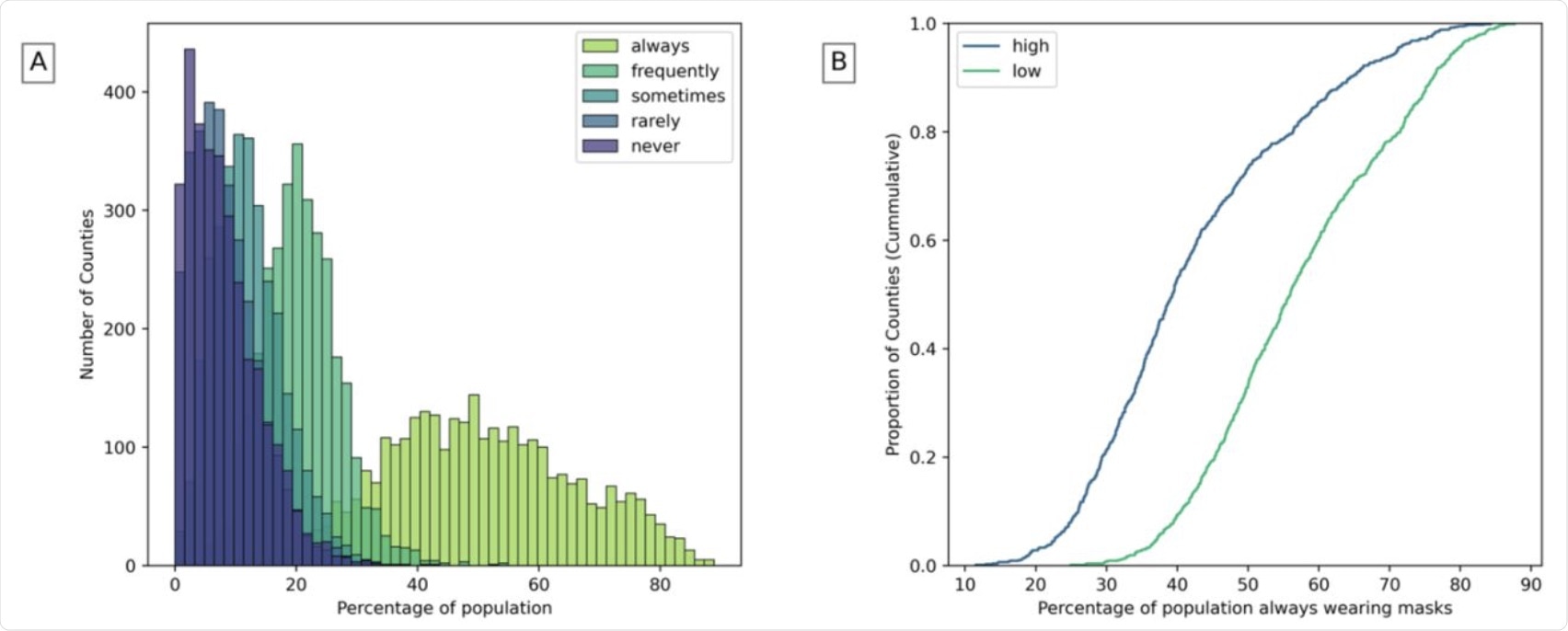 A) Population that wears masks in counties. B) Population that always wears masks in counties with high and low community health (The highest and lowest 25% of counties are considered).